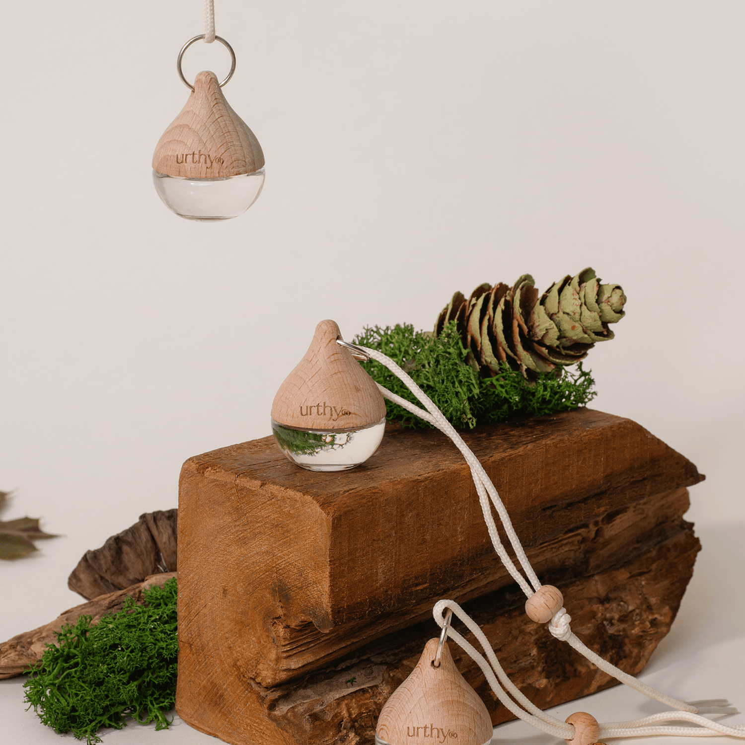 Simple, clean and refillable car diffuser naturally wicks the scent from the glass teardrop to diffuse scent in your car or anywhere you hang it.