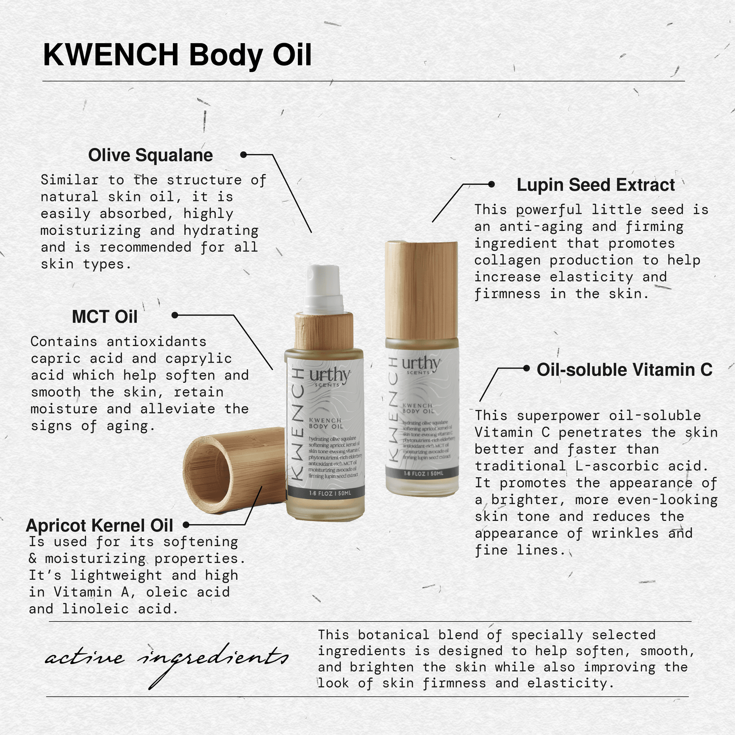 Kwench body oil packs a one-two punch of hydration + moisturizing. Hydrating ingredients attract water to the outermost layer of the skin, while moisturizing ingredients lubricate the skin to prevent water from escaping. Boom.
