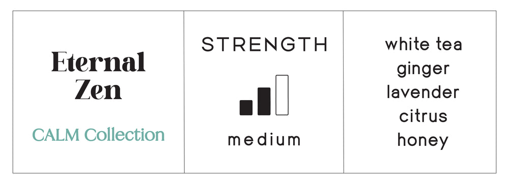 ETERNAL ZEN is a harmonious fragrance that combines white tea, ginger, lavender, citrus, and honey. It's both calming and invigorating creating a balanced zen-like scent.
